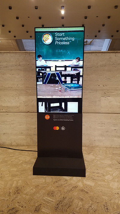 One of the more poignant campaigns I've worked on, Mastercard came to McCann looking for a way to help raise money, and awareness, for their World Food Program initiative. The idea manifested as a number of specialized kiosks that would sit in their main branches throughout the U.S. and be brought to different conventions as well. The concept: entice people to donate money, via the kiosk, to help provide lunches to school children in various countries around the world. Users would be shown a looping short video of an empty desk in a classroom with messaging. Once a user tapped their card or their phone to the hidden reader, donating a pre determined amount, it would progress the video to show a student sitting down and enjoying their time in class. This proceeded until the classroom had begun to fill up, then eventually resetting. These kiosks were completely fabricated and developed at Craft. A major first for me in dealing with card readers and payment centers. The hardest part, by far, was figuring out how to communicate with the incredibly archaic hex based API of the card reader and interface it with front end via node. The end result worked wonderfully and I had the pleasure of showcasing it at a handful of events and locations.