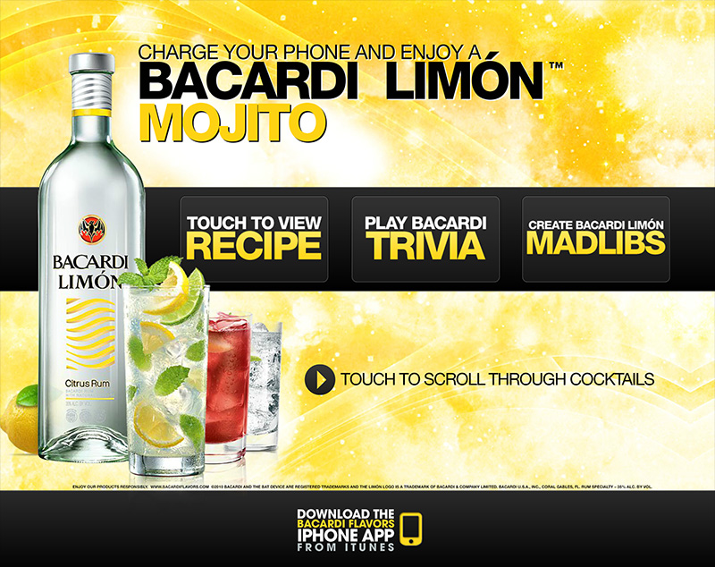 My first contract campaign in NYC! The task: create an engaging interactive front end experience to be shown in a phone charging station that would be distributed throughout NYC's bars all while staying on brand. The challenge: it had to be done in Flash and work well on the proprietary hardware that was already horribly out of date. The outcome was highly entertaining and had interactive drink recipes, Madlibs, trivia, and a number of Easter Eggs (including a hidden live radio station). The joy of actually seeing these eventually out in the wild was something I had never experienced before!